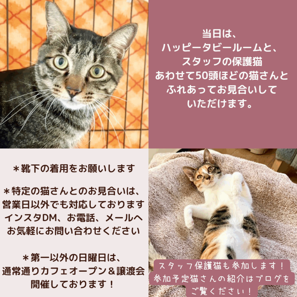 この日は二階の保護猫カフェ、一階のスタッフ保護猫譲渡会まで、すべて入場無料でご利用頂けます!