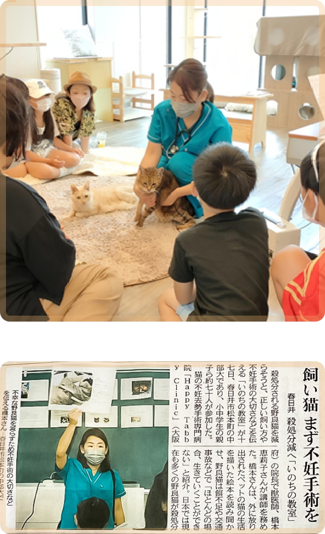 そこでHappy Tabbyでは、獣医師の言葉で、子供達に野良猫の置かれている問題や過酷な現状、たく さんの仔猫が犠牲になっていること、その原因となっているのが私たち人間であることを知っていただき、猫にも痛みや悲しみの感情があること、猫の正しい飼い方、不妊手術の大切さ、猫を絶対にすててはいけないことを伝える「命の教室」を実施しています。